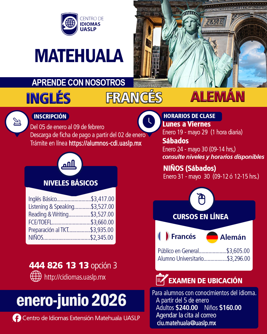 - Desde el año 2002 el Centro de Idiomas Extensión Matehuala se creó con el firme objetivo de ofrecer cursos de calidad para público en general en la ciudad y zonas circundantes. Actualmente cuenta además con inglés para niños de 6 años en adelante así como inglés, francés o alemán para adolescentes y adultos.